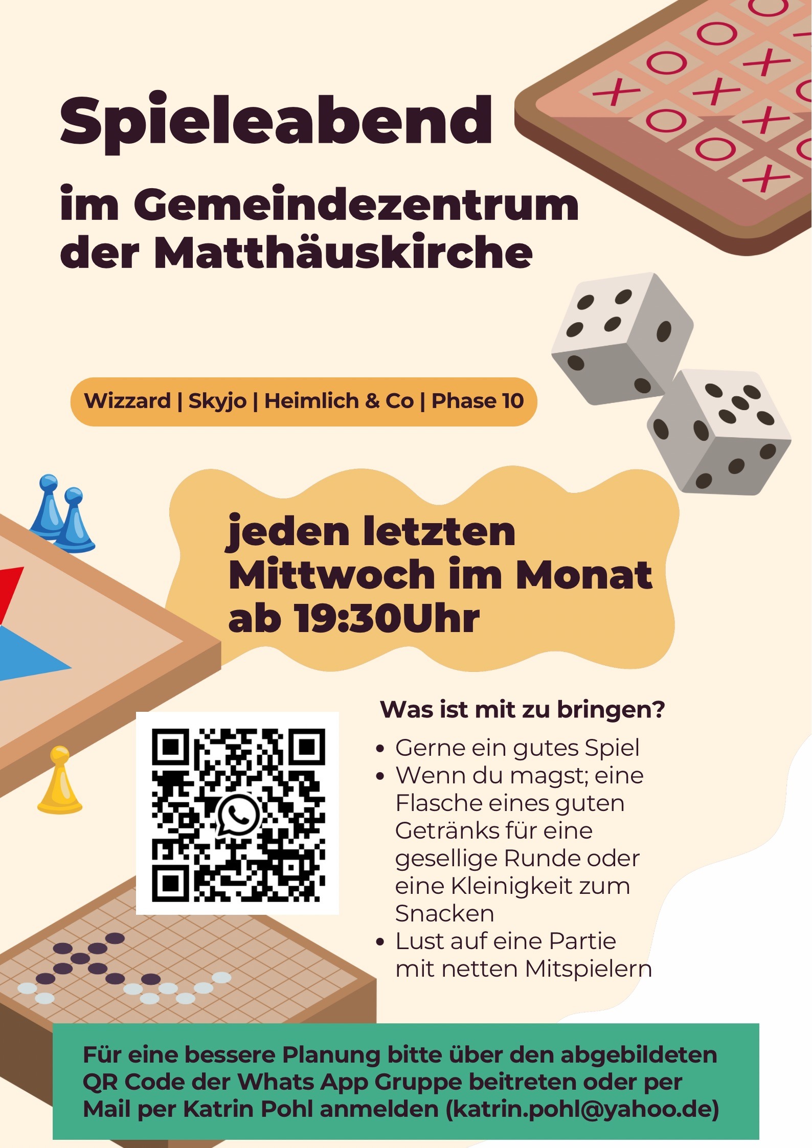 Ab diesem Monat laden wir herzlich zu einem Spieleabend im Gemeindehaus ein. Dieser findet künftig an jedem letzten Mittwoch im Monat statt. Ob Brettspiele, Kartenspiele oder einfach ein gemütlicher Abend in netter Gemeinschaft – alle sind willkommen, mitzumachen und eigene Spiele mitzubringen. Beginn ist jeweils um 19:30Uhr im Eltern-Kind-Raum in der Matthäuskirche. Wir freuen uns auf viele fröhliche Begegnungen und gemeinsame Stunden! Zur besseren Planung bitte über QR Code der bestehenden Gruppe in Whats App beitreten oder bei Katrin Pohl per Email anmelden: katrin.pohl@yahoo.de.