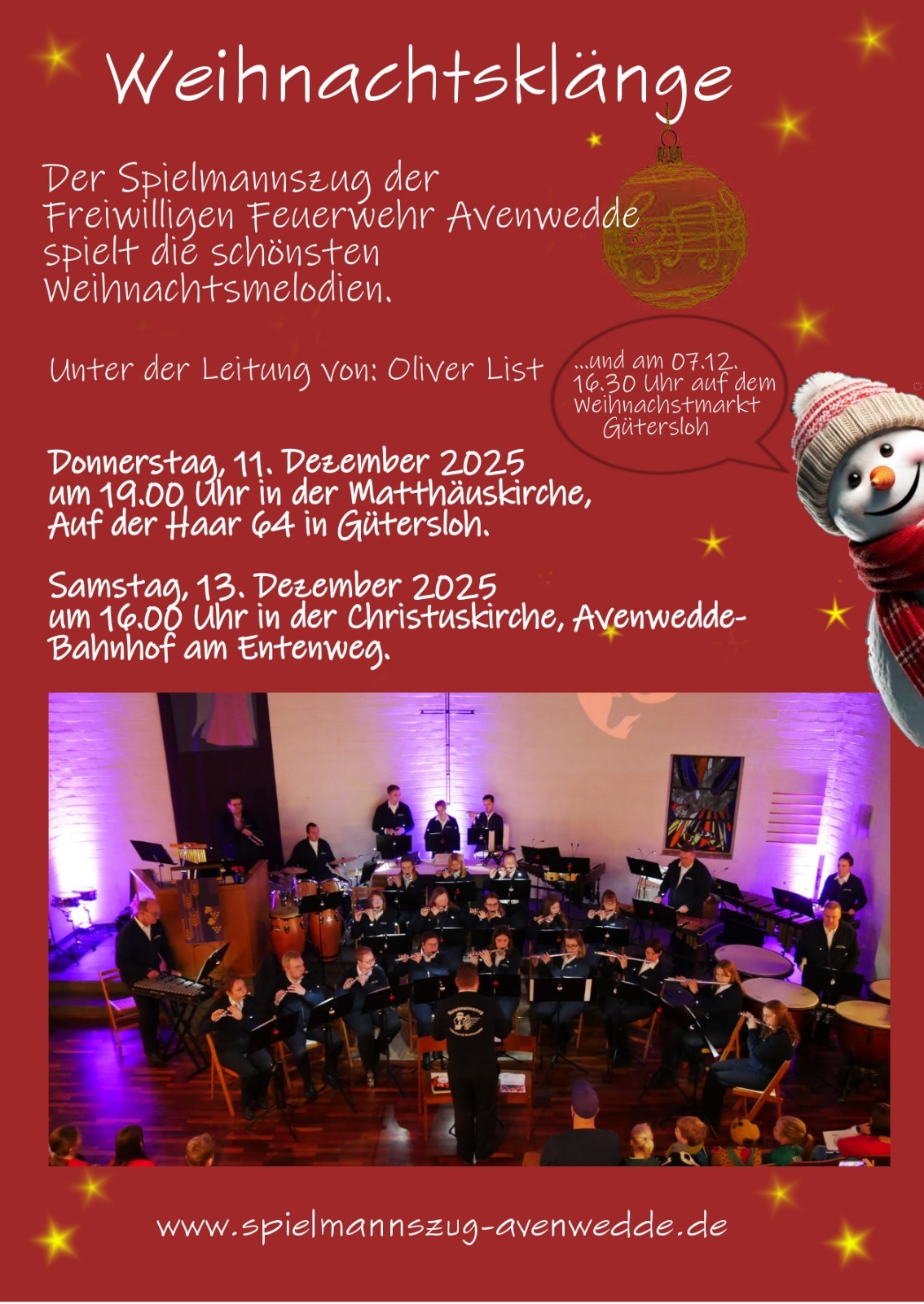 Der Spielmannszug Löschzug Avenwedde lädt Sie am 11.12. um 19.00 Uhr in die Matthäuskirche und am 13.12. um 16.00 Uhr in die Christuskirche Avenwedde zu weihnachtlichen Klängen ein.