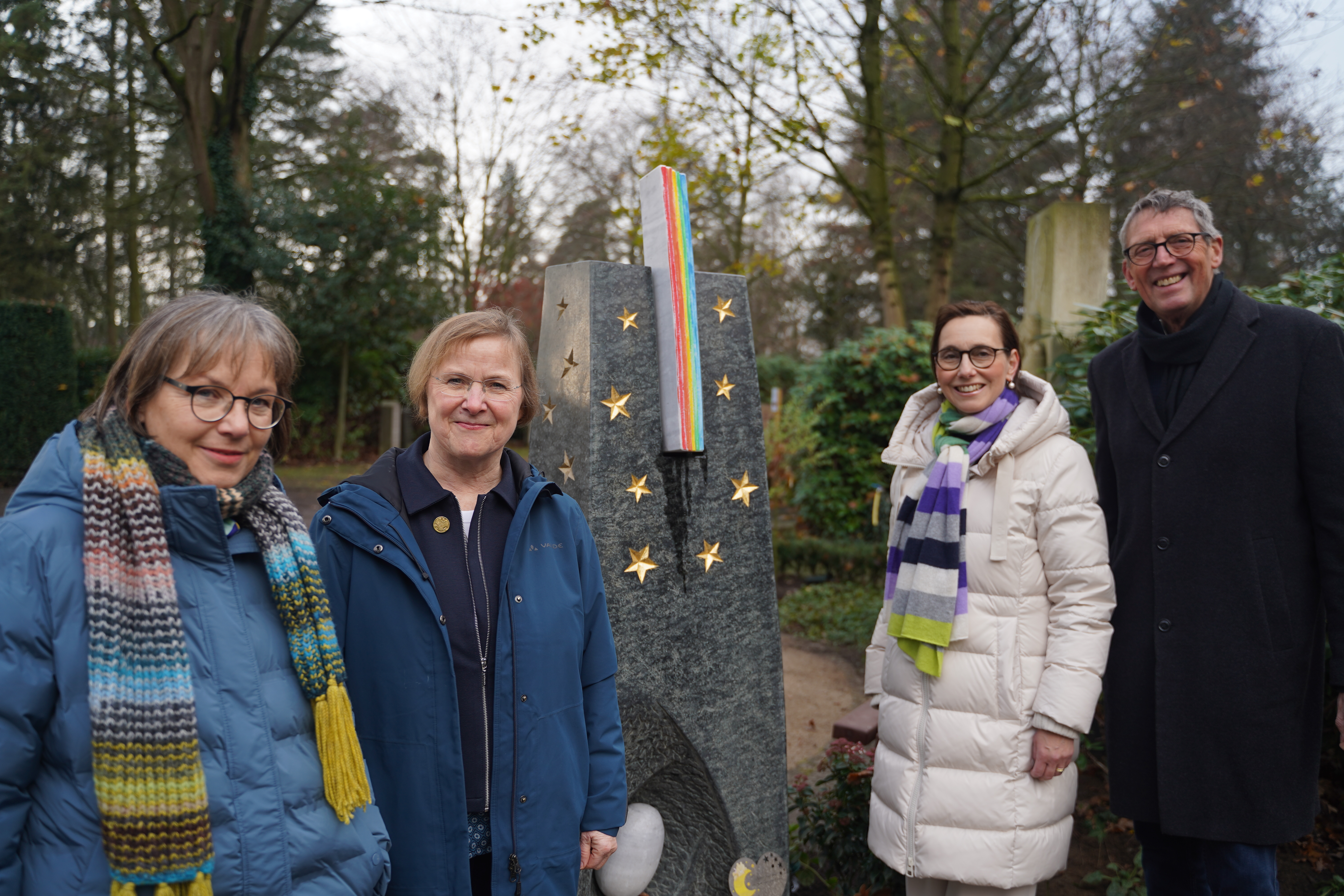 Der Bildhauer hat einen alten Granitstein, der in den Besitz des Friedhofs übergegangen war, zu einem zeitgemäßen Kunstwerk umgearbeitet: Mit goldenen Sternen, die schon von weitem leuchten. Ein bunter Regenbogen weist zum Himmel hin, und der Psalmvers auf der Rückseite fasst es in Worte: „Gott heilt die zerbrochenen Herzen. Er zählt die Sterne und nennt sie alle mit Namen“.