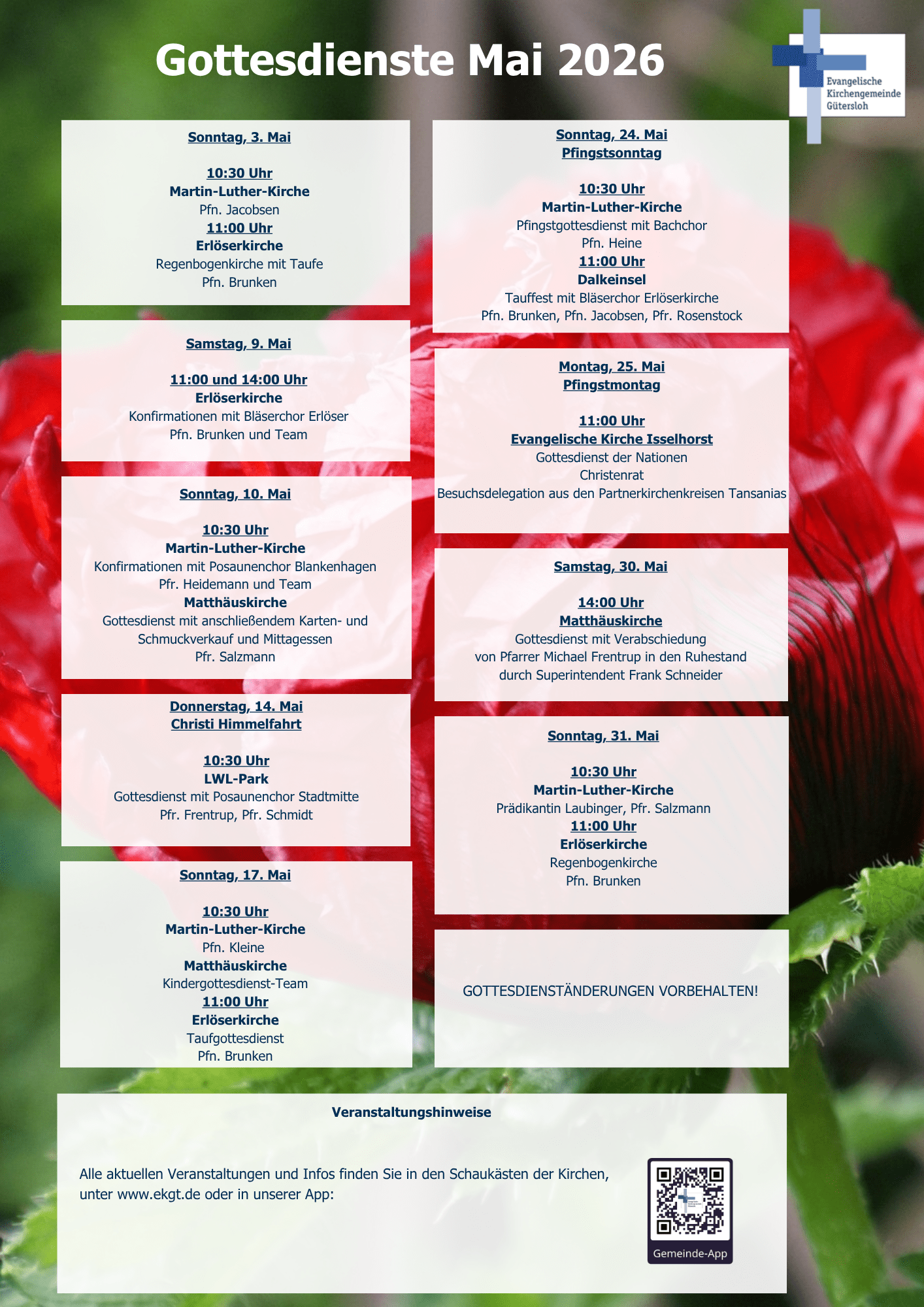 Übersicht Gottesdienste Mai 2026 Posted on April 23, 2026 by Dorina Kulessa-Dik in Aktuelles & Termine Folgend finden Sie eine Übersicht der Gottesdienste im Mai 2026: Download About Author Dorina Kulessa-Dik
