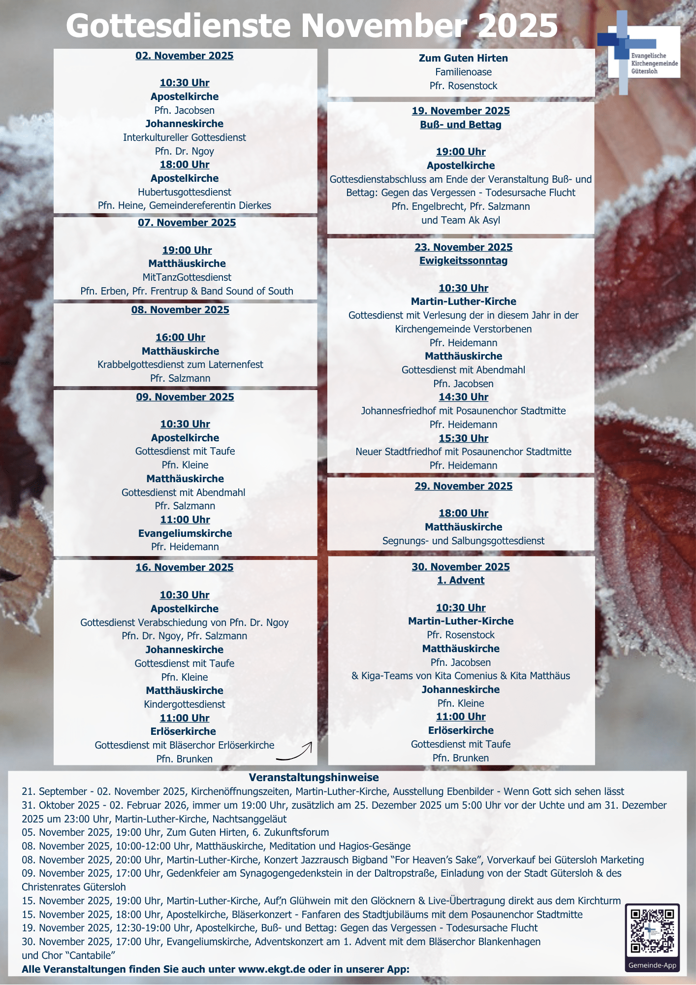 Übersicht Gottesdienste November 2025 Posted on August 28, 2025 by Dorina Kulessa-Dik in Aktuelles & Termine Folgend finden Sie eine Übersicht der Gottesdienste im November 2025: Gottesdienste November 2025 About Author Dorina Kulessa-Dik