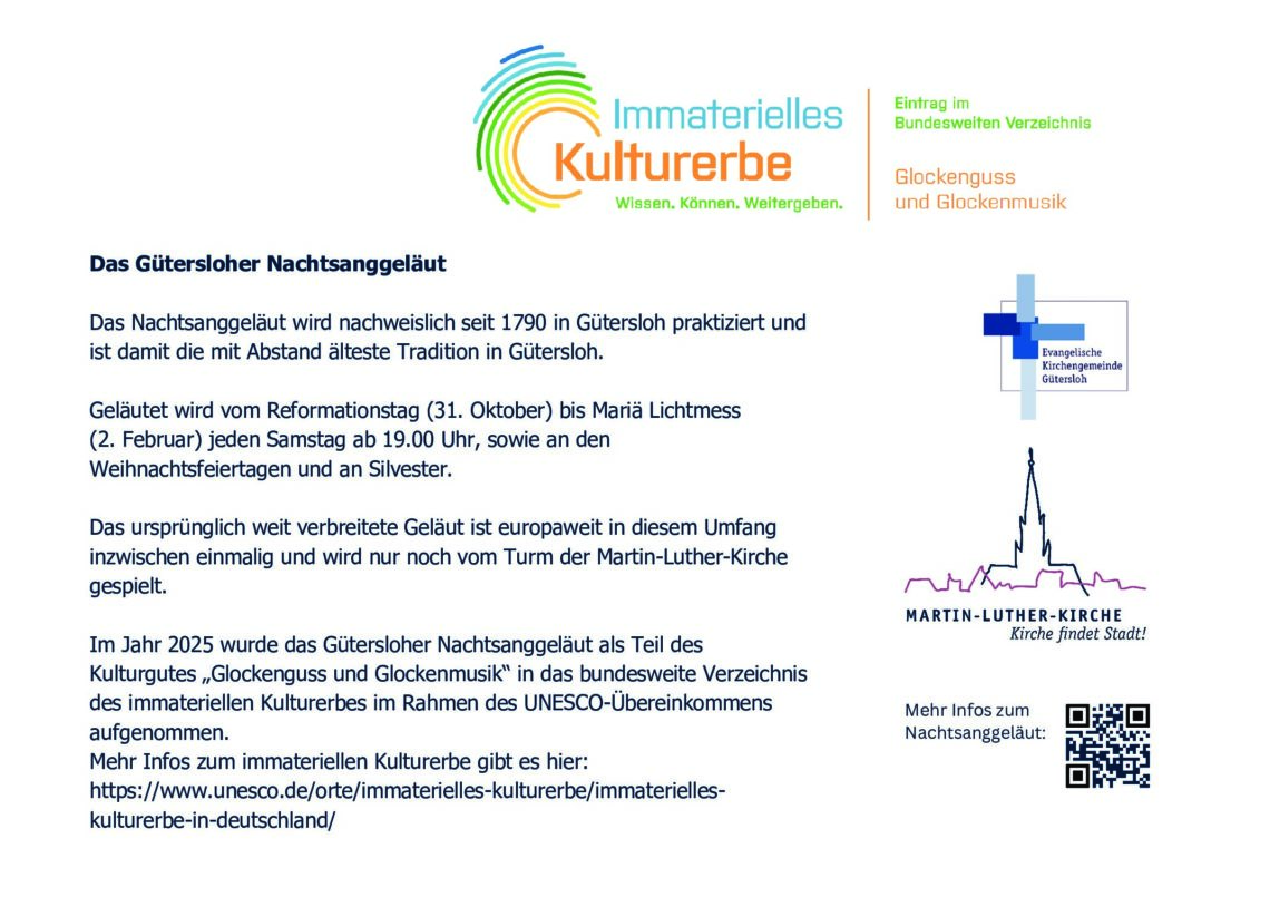 Die Evangelische Kirchengemeinde Gütersloh und das Glöckerteam sind stolz mitteilen zu dürfen, dass im Jahr 2025 das Gütersloher Nachtsanggeläut als Teil des Kulturgutes “Glockenguss und Glockenmusik” in das bundesweite Verzeichnis des immateriellen Kulturerbes im Rahmen des UNESCO-Übereinkommens aufgenommen wurde.