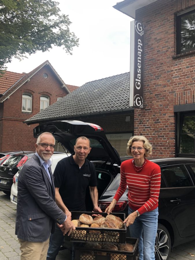Auch im Evangelischen Kirchenkreis Gütersloh haben evangelische und katholische Kirchengemeinden, die kreiskirchliche Verwaltung, kirchliche Einrichtungen und Institutionen leere Stifte gesammelt, dazu wurden in Finanzämtern, Filialen der Sparkassen und Banken, in Rathäusern und Schulen Sammelbehälter aufgestellt und die gefüllten Kartons in die Gemeindehäuser getragen. Hier sind sagenhafte 200 Kilo zusammengekommen, also rund ein Prozent aller in Deutschland gesammelten Stifte. Ulrich Granow, Presbyter der evangelischen Kirchengemeinde Gütersloh, ist immer wieder an die Stützpunkte gefahren und hat die Kartons zunächst bei sich Zuhause gestapelt und schließlich an die Recyling-Firma Terracyle, die auf schwer recycelbaren Abfall spezialisiert ist, geschickt. Pfarrerin Erika Engelbrecht (Gütersloh) dankt dem „Mann der Stifte“ für sein ehrenamtliches Engagement. „Vor einiger Zeit hatte Ulrich Granow mir einen Gutschein geschenkt, den ich für diese Aktion eingetauscht habe“, berichtet die Pfarrerin und überreicht ihm als Dank einen Kugelschreiber aus Marzipan. Mit ihr freut sich Anita Biermann vom Bezirksverband der Frauenhilfe im Kirchenkreis Gütersloh: „Ich habe nicht gedacht, dass die Aktion so viele Menschen mobilisiert.“